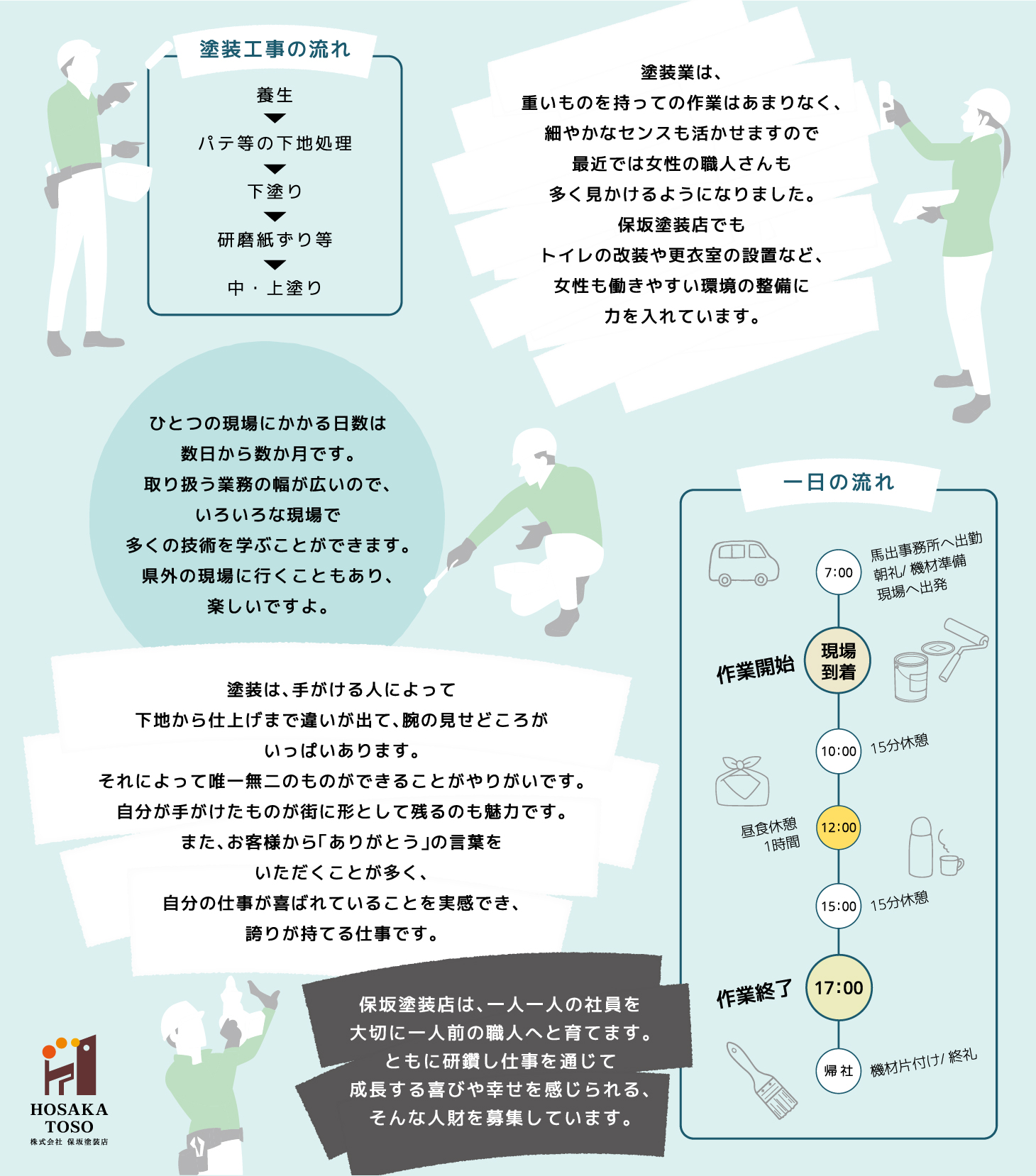 「次はこの仕事に挑戦してみよう」「将来を見据えてマネジメントも経験させておこう」など、社員ひとりひとりのスキルアップに目を向けてくれる会社です。だから毎日が刺激的で飽きない。また塗装の世界はとても奥が深く、10年目の現在でも先輩の達人技に驚かされてばかりです。一緒に切磋琢磨していきましょう。